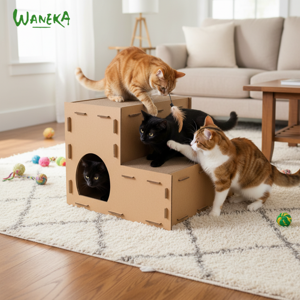 ¡Te presentamos el innovador rascador de cartón para gatos con diseño de dos escalones y espacio interior para esconderse de Waneka!